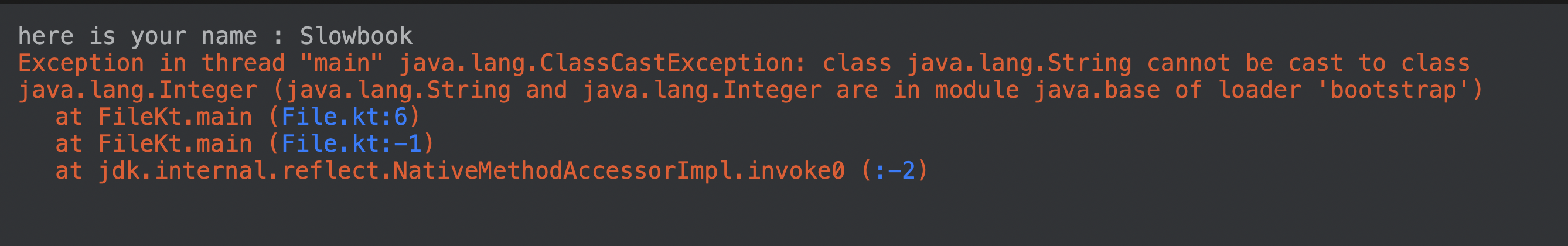 The variable 'age' can have Int data and null. However, chractername is String, which is unable to be assigned to the 'age'. This makes class cast exception.