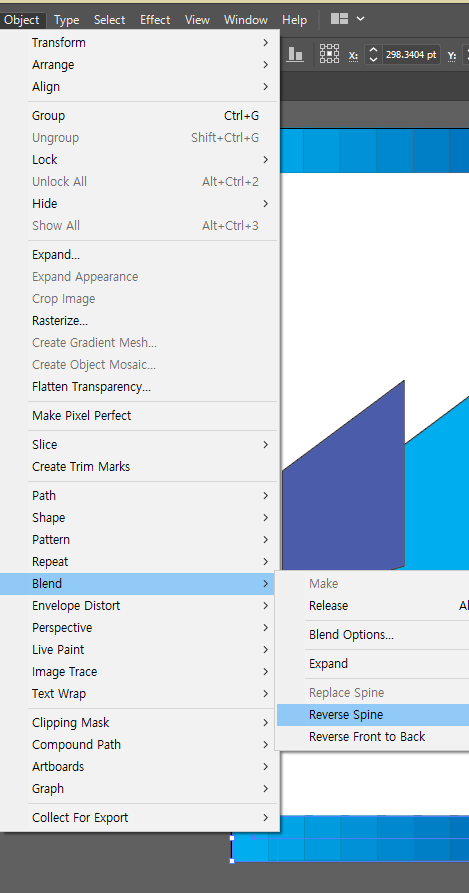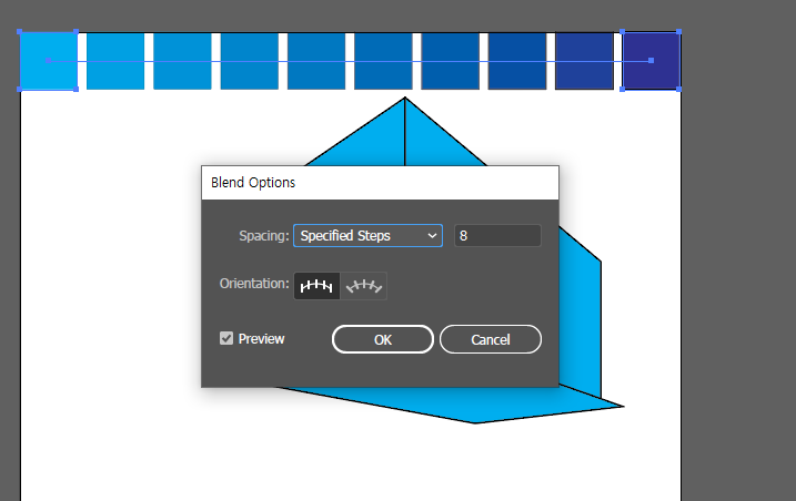 Blend options에 가면 혼합모드를 조정할 수 있다. 왼쪽은 연속적인 혼합 (blend)이고, 오른쪽은 단계가 있는 specified steps로 내가 설정한 갯수에 맞는 blend를 보여준다.