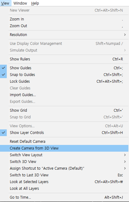 현재 보고있는 화면에서 카메라 설치하고 싶을 때 : create camera from 3D view
