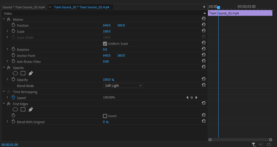 blend 모드 조절 - soft light로 변경 (이미 find edges 적용된 클립을 soft ligth로 자연스럽게 혼합)