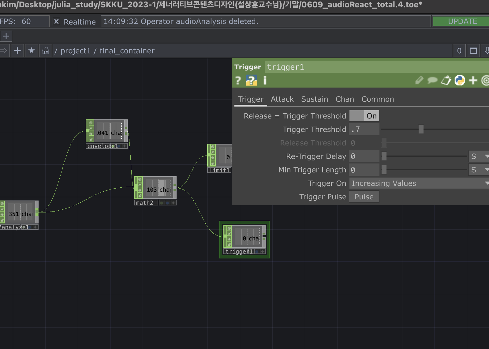 3) lag 자연스러움 위해 추가, envelope, math ctrl c ctrl v로 데이터 0과 1 사이로 흐르게